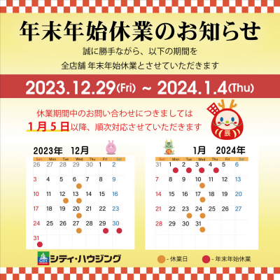 さて、シティ・ハウジング株式会社(シティグループ全社)では年末年始の休業日につきまして、下記のとおりとさせていただきます。