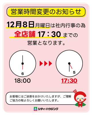 誠に勝手ながら、社内行事のため、下記の通り営業終了時間を変更させていただきます。